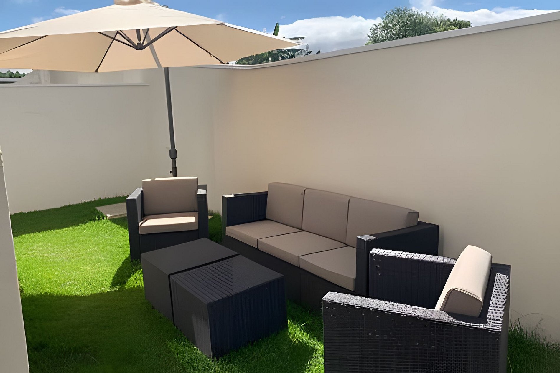 The apartment features 2 bedrooms, an integrated living room, a spacious bathroom, laundry, garden area, and balcony with barbecue. The kitchen is fully equipped; bedding, towels, household items, games, basic cleaning supplies, and convenience items are provided.